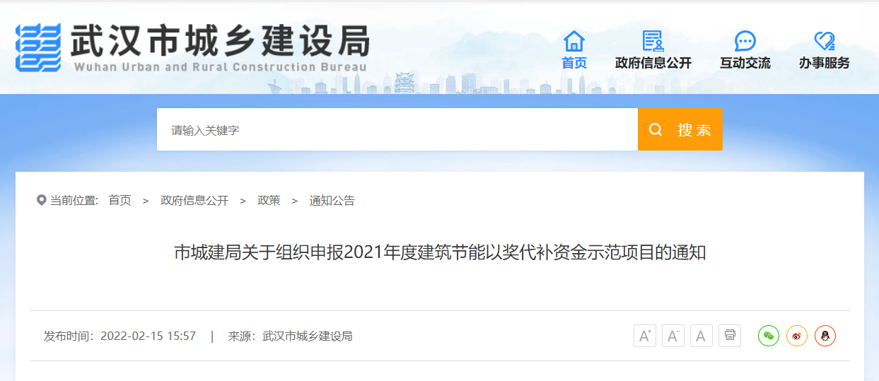 為加快推進生態文明建設,落實綠色發展理念,提升建筑節能水平,根據《湖北省建筑節能以獎代補資金管理辦法》(鄂財建發〔2017〕37號)、《武漢市省級建筑節能以獎代補資金使用管理辦法》(武城建〔2020〕38號),決定開展2021年度建筑節能以獎代補資金示范項目申報工作,現將有關事宜通知如下: