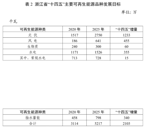 大力發(fā)展風電、光伏,實施"風光倍增計劃"; 更好發(fā)揮以抽水蓄能為主的水電調節(jié)作用;因地制宜高質量發(fā)展生物質能、地熱能、海洋能等。到 2025 年底,可再生能源裝機超過 5000 萬千瓦,裝機占比達到 36%以上。我省"十四五"主要可再生 能源品種發(fā)展目標如下∶