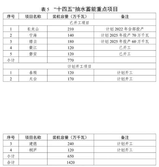 有序發(fā)展抽水蓄能電站。積極推進長龍山、寧海、縉云、衢江、磐安等抽水蓄能開工項目的建設,穩(wěn)妥開展泰順、天臺等抽水蓄能電站項目前期工作,適時啟動建德、桐廬站點的前期工作。結合現(xiàn)有站點,合理規(guī)劃布局,積極推動新一輪抽水蓄能電站選點工作。加強抽水蓄能電站建設管理體制、電價機制等研究。"十四五"期間,全省抽水蓄能電站力爭新增裝機容量 340 萬千瓦,累計裝機容量達到798 萬千瓦。