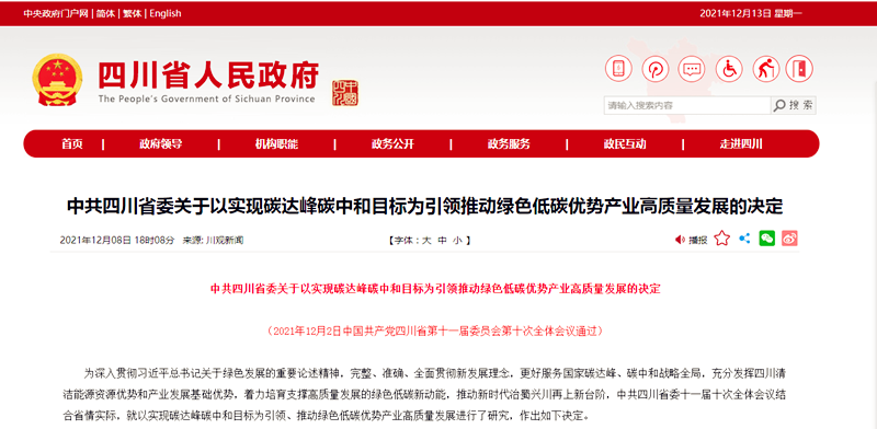 12月8日,中共四川省人民政府在官網發(fā)布了《中共四川省委關于以實現(xiàn)碳達峰碳中和目標為引領推動綠色低碳優(yōu)勢產業(yè)高質量發(fā)展的決定》(以下簡稱《方案》)。