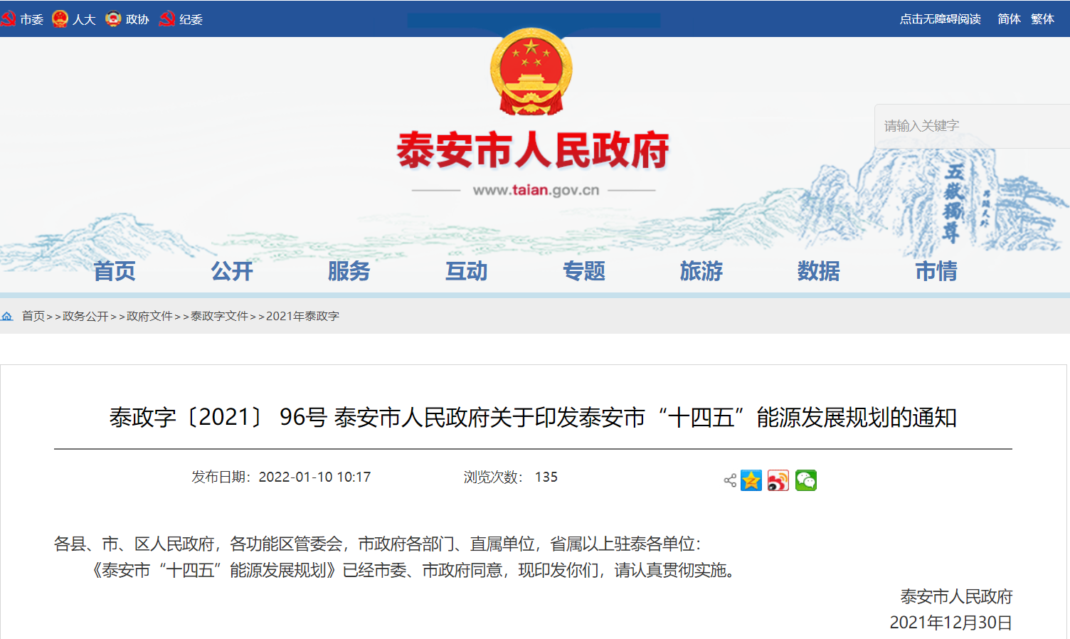 文章來源:地大熱能 發布作者:山東省泰安市人民政府 發表時間:2022-01-12 09:06:56瀏覽次數:4353