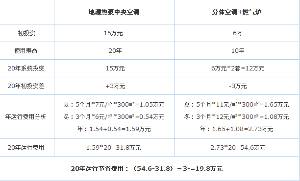 1 、初投資比較。別墅地源熱泵中央空調(diào)初投資比較機組初投資比冷水機組增加20%左右;增加打井費用;無冷卻水塔和冷卻水系統(tǒng);無鍋爐和鍋爐房;無入網(wǎng)費(天然氣、城市熱力網(wǎng));無儲油罐安全費。