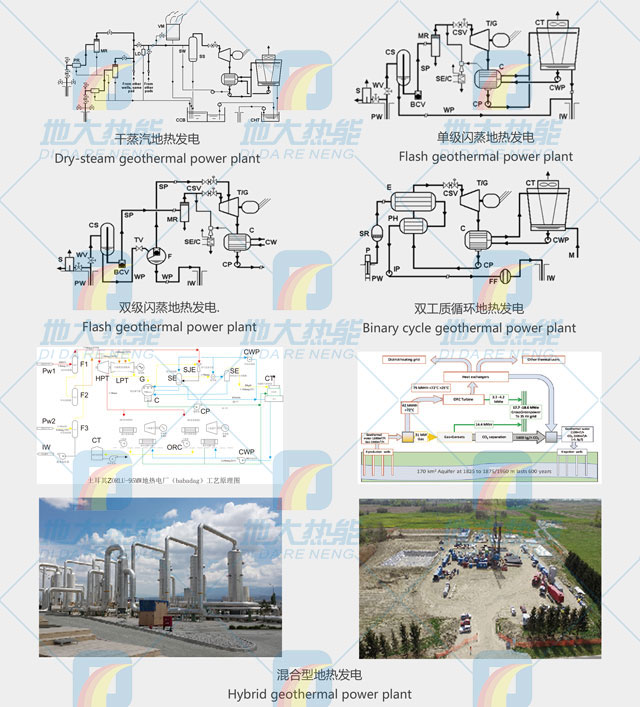 地?zé)岚l(fā)電需根據(jù)地?zé)崃黧w的溫度、壓力以及它們的水、汽品質(zhì)的不同而采取不同的設(shè)計方案。其主要類型包括:干蒸汽地?zé)岚l(fā)電、單級閃蒸地?zé)岚l(fā)電、雙級閃蒸地?zé)岚l(fā)電、一井一站地?zé)岚l(fā)電、混合型地?zé)岚l(fā)電、雙工質(zhì)循環(huán)地?zé)岚l(fā)電、干熱巖發(fā)電。