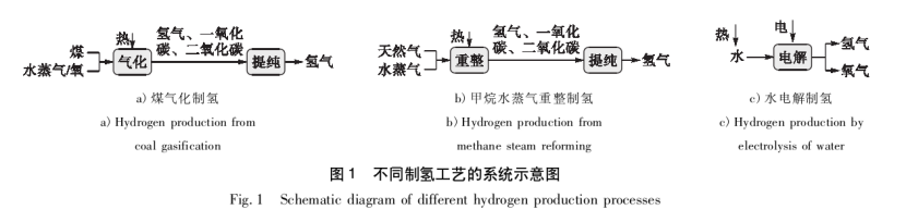 水電解工藝中ALK和PEM制氫工藝對溫度要求較低,技術成熟,但SOEC制氫工藝的工作溫度較高(約 900℃),目前處于產品試驗階段。電能可由太陽能、風能、水力能和地熱能等可再生能源獲取。水電解制氫只產生氫氣和氧氣,沒有二氧化碳排放,通常稱為綠氫,見圖1-c)。光解制氫工藝是利用太陽能的光熱來制取氫氣的前瞻性技術路線,包括太陽光催化分解水制氫、太陽光電化學分解制氫以及太陽能熱化學循環制氫,目前仍處于研究階段。